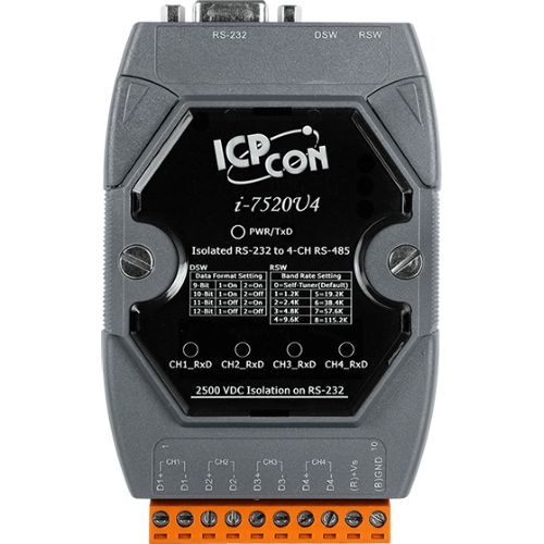Introduction RS-485 Active Star Wiring Hub The I-7520U4 is isolated RS-232 to 4-ch RS-485 active star wiring hub, it has 4 independent RS-485 output channels and one RS-232 input channel.