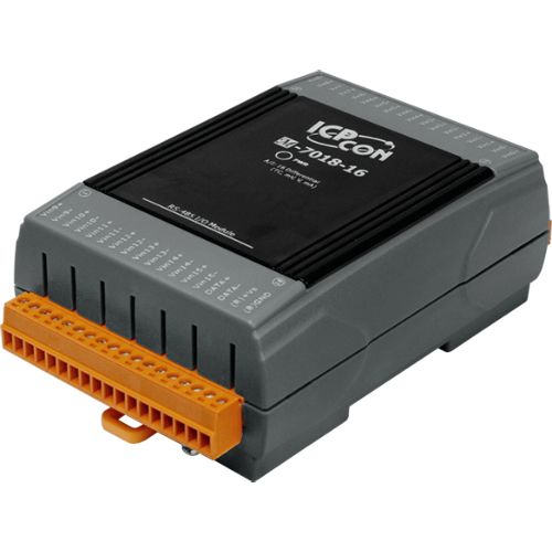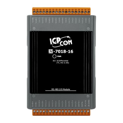 The M-7018-16 is an analog input module that includes 16 differential analog input channels. The voltage input range can be from ±15 mV to ±2.5 V, the current input range can be either +4 to +20 mA, 0 to +20 mA, or ±20 mA, and types J, K, T, E, R, S, B, N, C, L, M, LDIN43710 thermocouple can be used for the thermocouple input. Overvoltage protection of up to 30 VDC is provided. The module also features per-channel open wire detection for the thermocouple input types, and provides 4 kV ESD protection as well as 3000 VDC intra-module isolation.