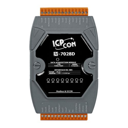 The M-7028 is a 12-bit, 8-channel analog output module. It provides a programmable output range on all analog output channels (0 ~ 5 V, +/-5 V, 0 ~ 10 V, +/-10 V, +4 ~ +20 mA or 0 ~ +20 mA). Each analog output channel can be configured for an individual range and the module also features per-channel open wire detection for the +4 ~ +20 mA output, together with 8 kV ESD Protection as well as 3000 VDC intra-module isolation. Options for configuring power-on and safe values are also included.