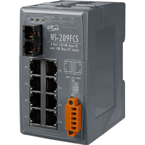 The NS-209FC (SC Connector; Multi-mode) is a Unmanaged 8-Port Industrial Ethernet(10/100Base-TX) to Fiber Optics(100Base-FX) converter that secures data transmission by using fiber optic transmission to provide immunity from EMI/RFI interference. It is used Ethernet for transmitting a signal up to 2 Km(6,600 ft), and is the perfect solution for applications where transmission must be protected from electrical exposure, surges, lightning or chemical corrosion.