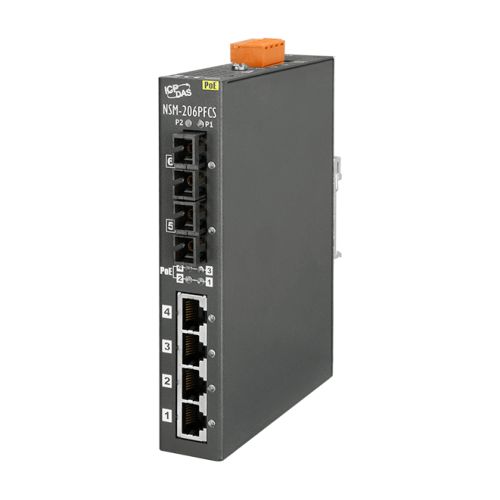 The NSM-206PFCS is 6-port unmanaged Ethernet switch supporting Power-over-Ethernet on ports 1 to 4. The switch is classified as power source equipment (PSE), and when used in this way, the NSM-206PFCS enable centralization of the power supply, providing up to 30 watts. The NSM-206PFCS can be used to power IEEE 802.3af/at standard devices (PD).