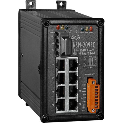 The NSM-209FC (SC Connector; Multi-mode) is a Unmanaged 8-Port Industrial Ethernet(10/100Base-TX) with Fiber(100Base-FX) Switch that secures data transmission by using fiber optic transmission to provide immunity from EMI/RFI interference. It is used Ethernet for transmitting a signal up to 2 Km(6,600 ft), and is the perfect solution for applications where transmission must be protected from electrical exposure, surges, lightning or chemical corrosion.
