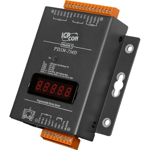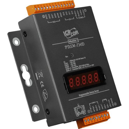 PDSM-734D CR, Programmable (1x RS-232, 1x RS-485 and 1x RS-422/485) Serial-to-Ethernet Device Server with 4x Digital input, 4x Digital output and LED Display (Metal Case)