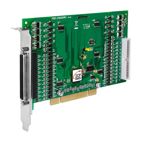 PISO-P32S32WU has 32 channels of optical-isolated DI and 32 channels of optical-isolated open-collector output board (8-channel for 500 mA and 24-channel for 100 mA current sinking output, NPN), arranged into four isolated banks. Each input channel use a photo-coupler to isolate the card and computer from external signal. Each digital output offers a NPN transistor and integral suppression diode for inductive load. PISO-P32S32WU requires external power to drive the D/I and D/O ports and supports Card ID (jumper) features for multi-board identification and supports both 5 V and 3.3 V PCI slot.