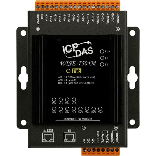 WISE-7504M is a multi-function module with 4-channel analog inputs, 4-channel analog outputs and 4-channel digital inputs. It provides various programmable analog inputs, and analog outputs. Each analog input is allowed to configure a proper range with 240 Vrms high voltage protection. WISE-7504M follows IEEE 802.3af-compliant Power over Ethernet (PoE) specification. It allows receiving power from PoE enabled network by Ethernet pairs. In additional to this, WISE-7504M also has a built-in two-port Ethernet switch to implement daisy-chain topology. The cabling is much easier and total costs of cable and switch are significantly reduced.