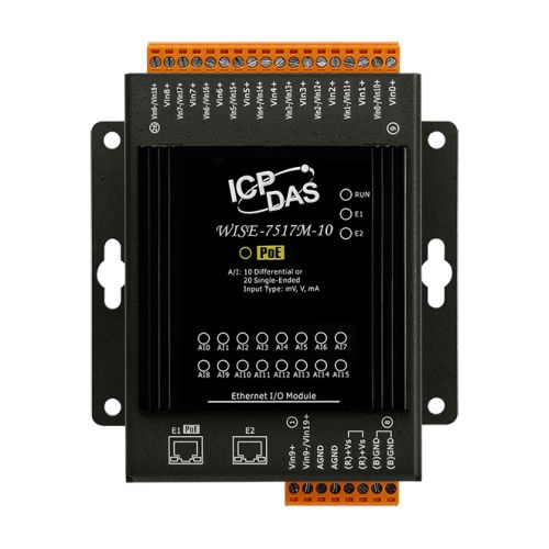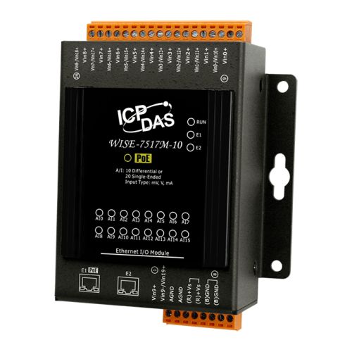 WISE-7517M-10 is a module with 10-channel differential or 20-channel single-ended analog inputs. It provides programmable input range on all analog channels. Each analog channel has 240 Vrms high overvoltage protection. Each analog input can be programmed to accept voltage or current as input depending upon the position of corresponding jumper. It also has qualification for 4 kV ESD protection as well as 3000 VDC intra-module isolation. WISE-7517M-10 follows IEEE 802.3af-compliant Power over Ethernet (PoE) specification. It allows receiving power from PoE enabled network by Ethernet pairs. In additional to this, WISE-7517M-10 also has a built-in two-port Ethernet switch to implement daisy-chain topology. The cabling is much easier and total costs of cable and switch are significantly reduced.