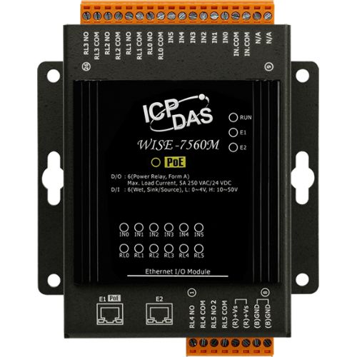 WISE-7560M provides 6 wet contact digital input channels and 6 form A electromechanical relays. It features optical isolation for 3000 VDC of transient overvoltage protection and doesn’t have channel-to-channel isolation. Note: When inductive loads are connected to the relays, a large counter electromotive force may occur when the relay actuates because of the energy stored in the load. These flyback voltages can severely damage the relay contacts and greatly shorten the relay life. Limit these flyback voltages at your inductive load by installing a flyback diode for DC loads or a metal oxide varistor for AC loads. WISE-7560M follows IEEE 802.3af-compliant Power over Ethernet (PoE) specification. It allows receiving power from PoE enabled network by Ethernet pairs. In additional to this, WISE-7560M also has a built-in two-port Ethernet switch to implement daisy-chain topology. The cabling is much easier and total costs of cable and switch are significantly reduced.